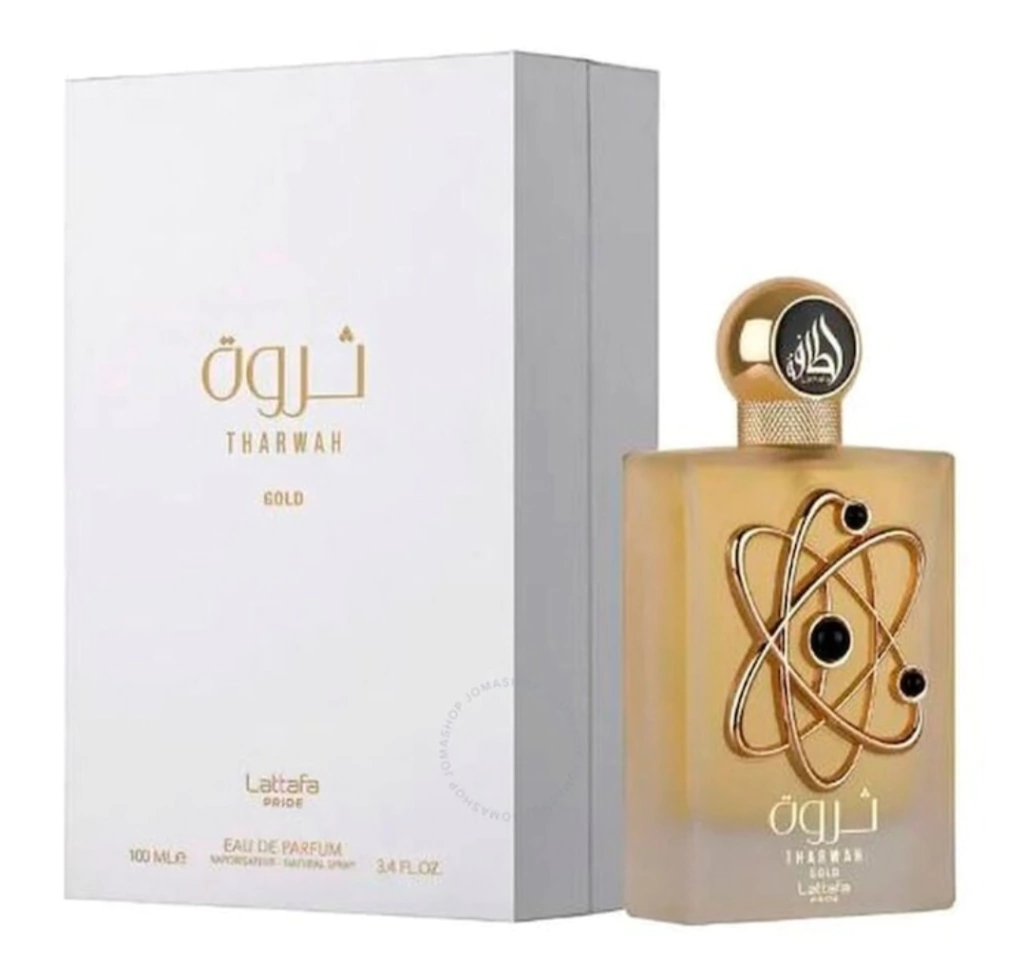 Tharwah Gold de Lattafa Perfumes é um perfume Oriental Floral Feminino. Esta é uma nova fragrância. Tharwah Gold foi lançada em 2022. As notas de topo são: Lavanda e Bergamota. As notas de coração são: Flor de Laranjeira e Jasmim Egípcio. As notas de fundo são: Baunilha, Âmbar e Vetiver.